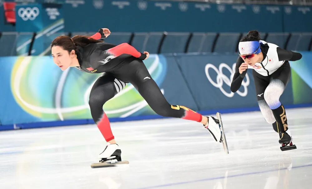 △ 2月5日,中国运动员韩梅(左)和日本运动员高木美帆在训练中。新华社记者 武巍 摄